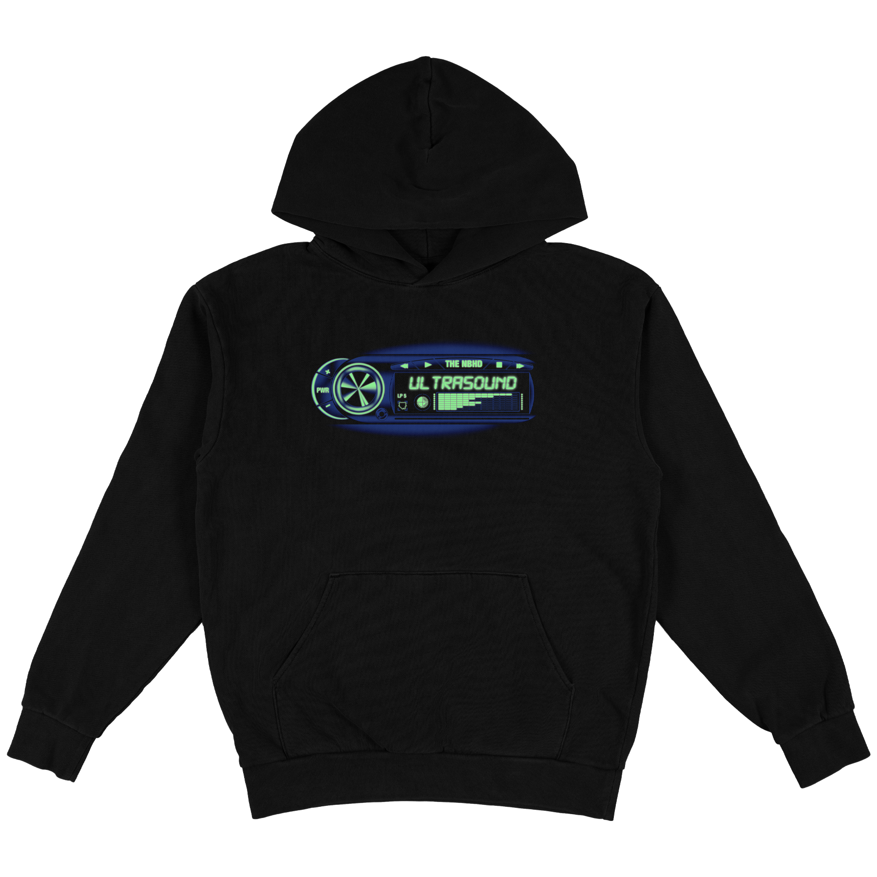 "Car Stereo" design printed in glow in the dark ink on the front of a black, heavyweight pullover hoodie.